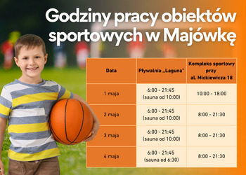Godziny pracy - Majówka Zapraszamy do aktywności fizycznej także w majówkę! Godziny otwarcia Pływalni i kompleksu sportowego przy Mickiewicza dostępne na grafice. Udanego wypoczynku!