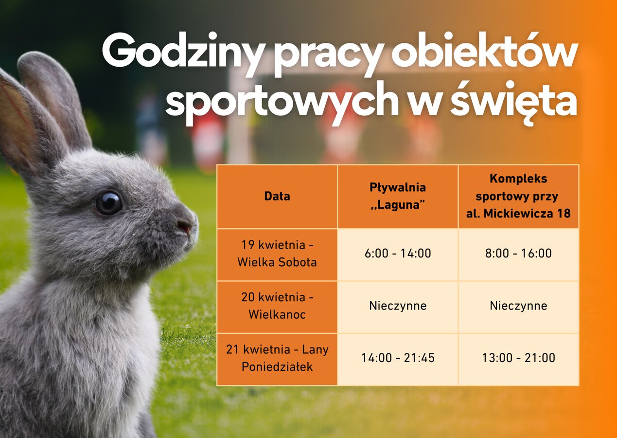 Godziny pracy obiektów w dniach 19-21 kwietnia - Wielkanoc Zapraszamy na Pływalnię i boiska w długi weekend. Udanej zabawy!