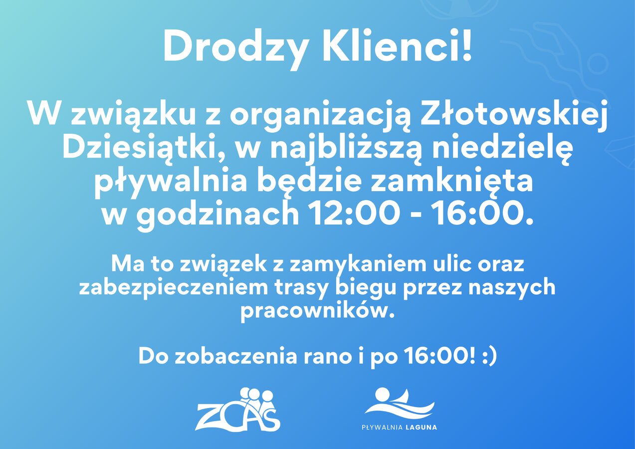 Godziny pracy pływalni 14.09.2025 Szanowni Klienci, 14.09 wystąpią ograniczenia w pracy Laguny, w związku z organizacją przez nas biegu "Złotowska Dziesiątka". Zachęcamy do przeczytania komunikatu graficznego.